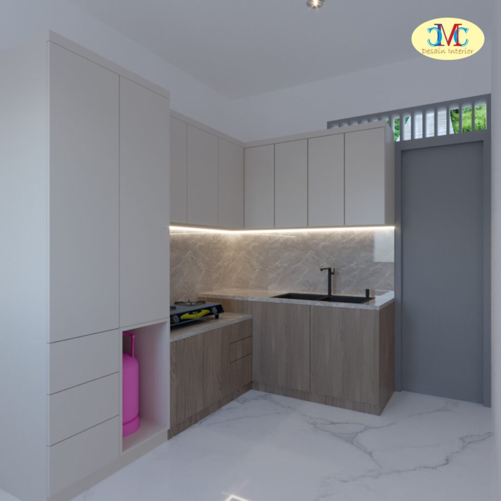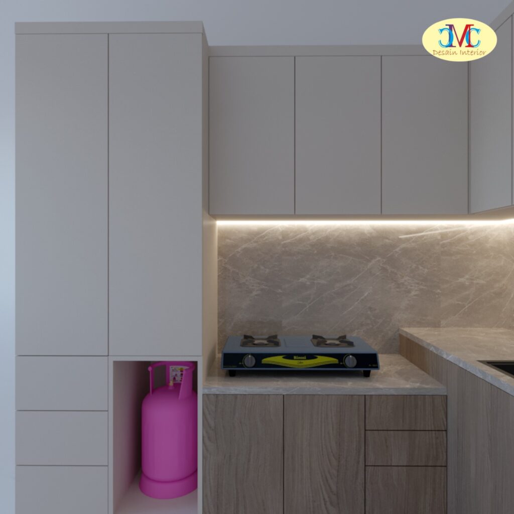 3. Penataan Gas dan Area Masak yang Rapi Salah satu detail unik dalam design kitchen set kali ini adalah adanya dedicated space untuk tabung gas di samping kabinet tinggi. Hal ini memastikan area lantai tetap bersih dan tabung gas tidak mengganggu estetika dapur.